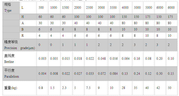 不易變形:一般鋼材材質的曲服點是30kg/mm2,一般鑄鐵件的曲服點是38kg/mm2此材質的曲服點達到110kg/mm2,抗彎曲指標遠遠超出了其它材質。 容易保管:懸掛、平放均可,不會因長期平放影響其直線度、平行度。 不易生秀:使用期間不用涂油,長期不使用,存放時輕輕地涂上薄薄的一層一般工業油即可。